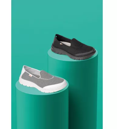 Sportinio stiliaus antistatiniai pusbačiai be apsaugų, be raištelių, iš vientisos tinklinės kvėpuojančios medžiagos. Paminkštintas drėgmę išgarinančiu pamušalu viduje D’DRY®